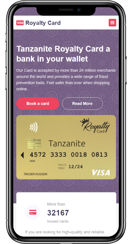 Tanzanite Royalty Card is a globally recognized brand From Tanzania which uses the latest payment and security technology,Tanzanite Royalty Card is accepted by more than 24 million merchants and provides a wide range of fraud prevention tools. Feel safer than ever when shopping online using your Tanzanite Royalty card in conjunction with the Verified by programme.
